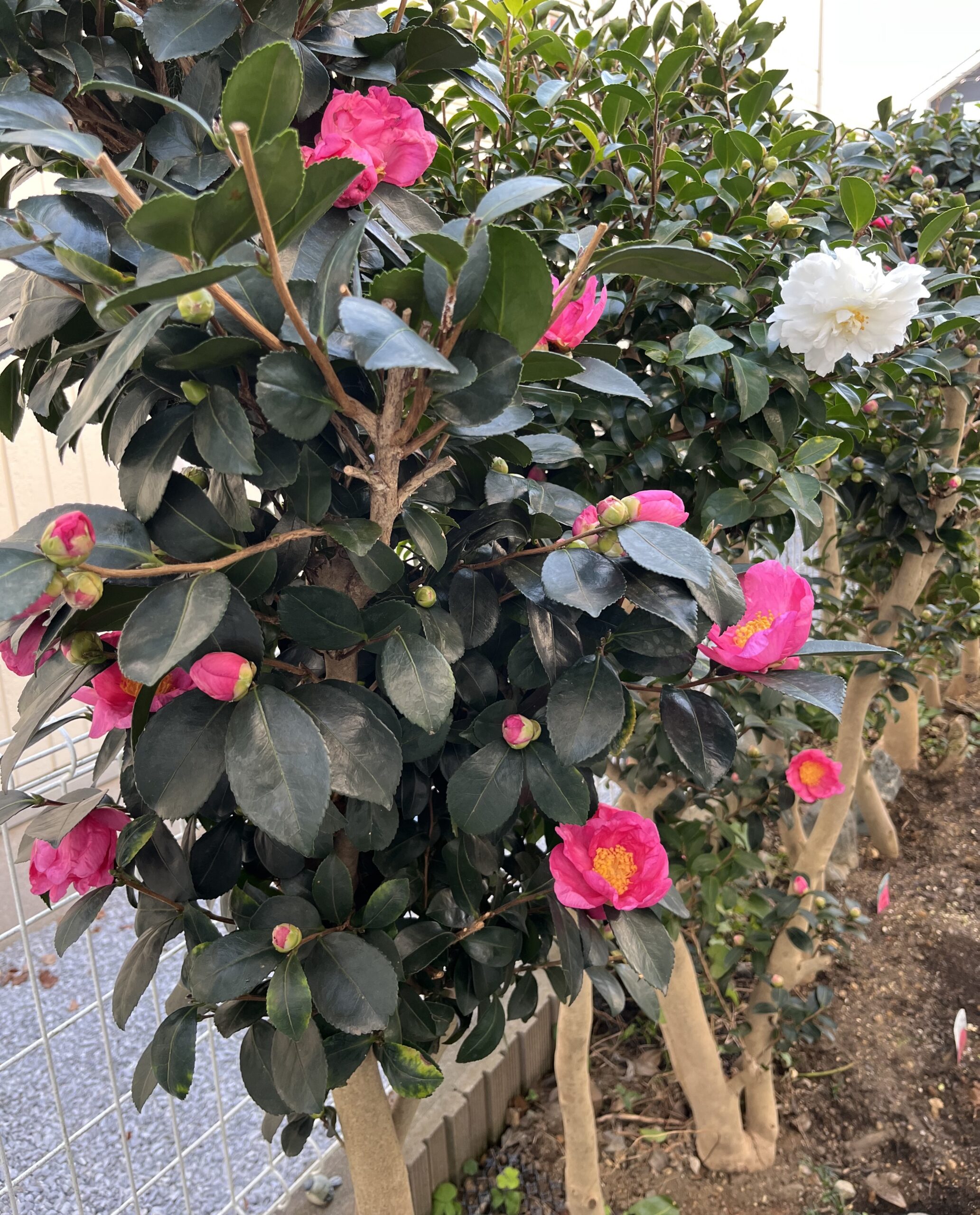 最後に我が家の2階のベランダから見下ろしたサザンカの生垣の姿を見てもらう。シャクヤク花壇との位置関係も分かると思う。