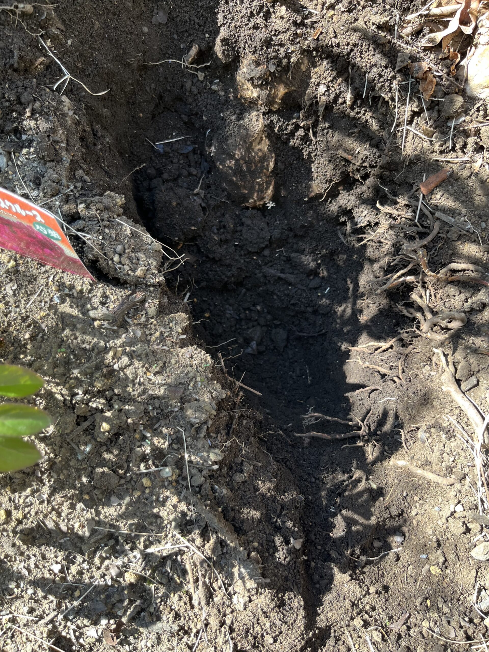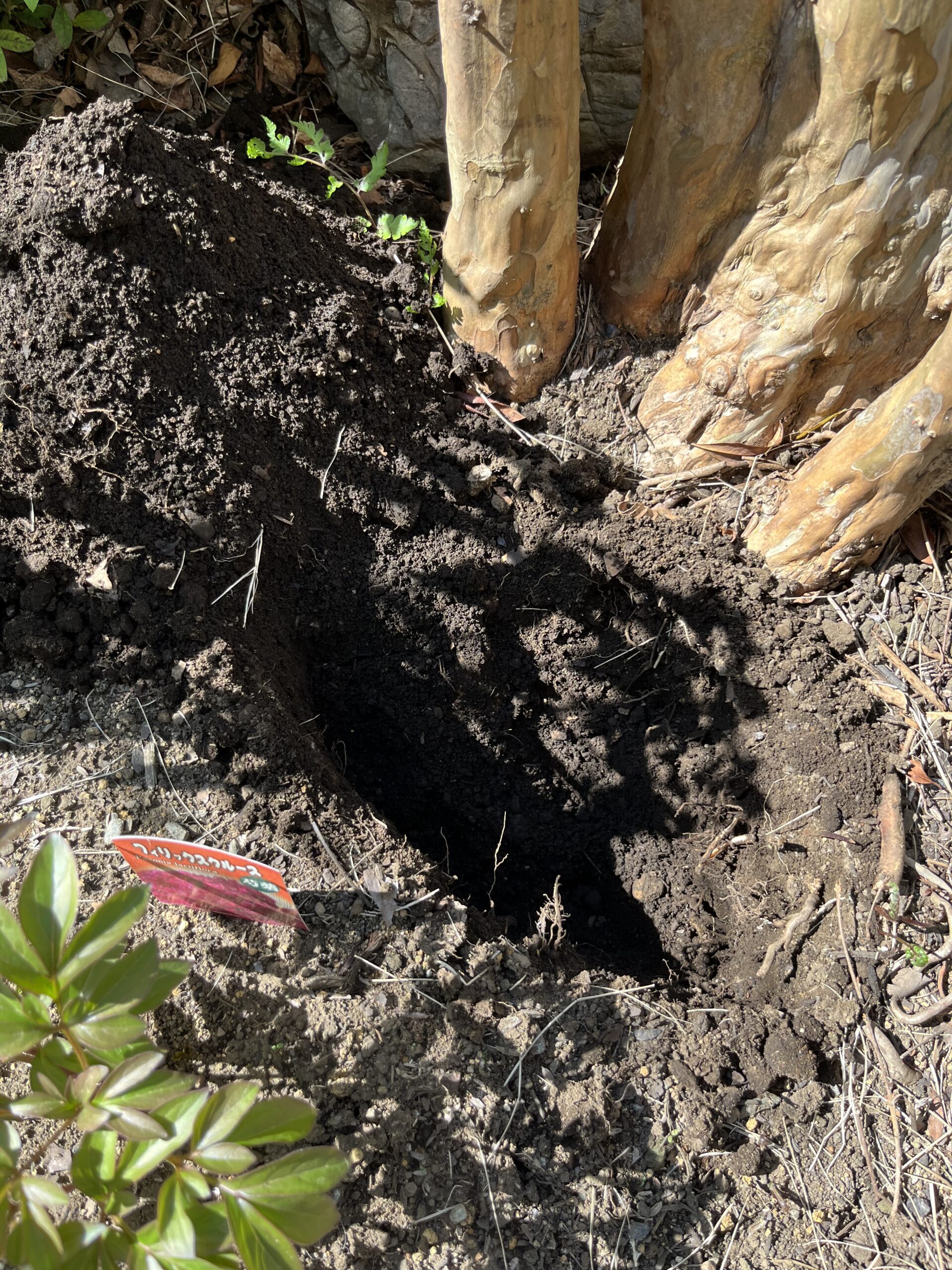 そこでギリギリの部分を見極めて、穴を掘った。案の定、太いサルスベリの根っこにぶつかったが、一部をのこぎりで切って、穴を掘った。