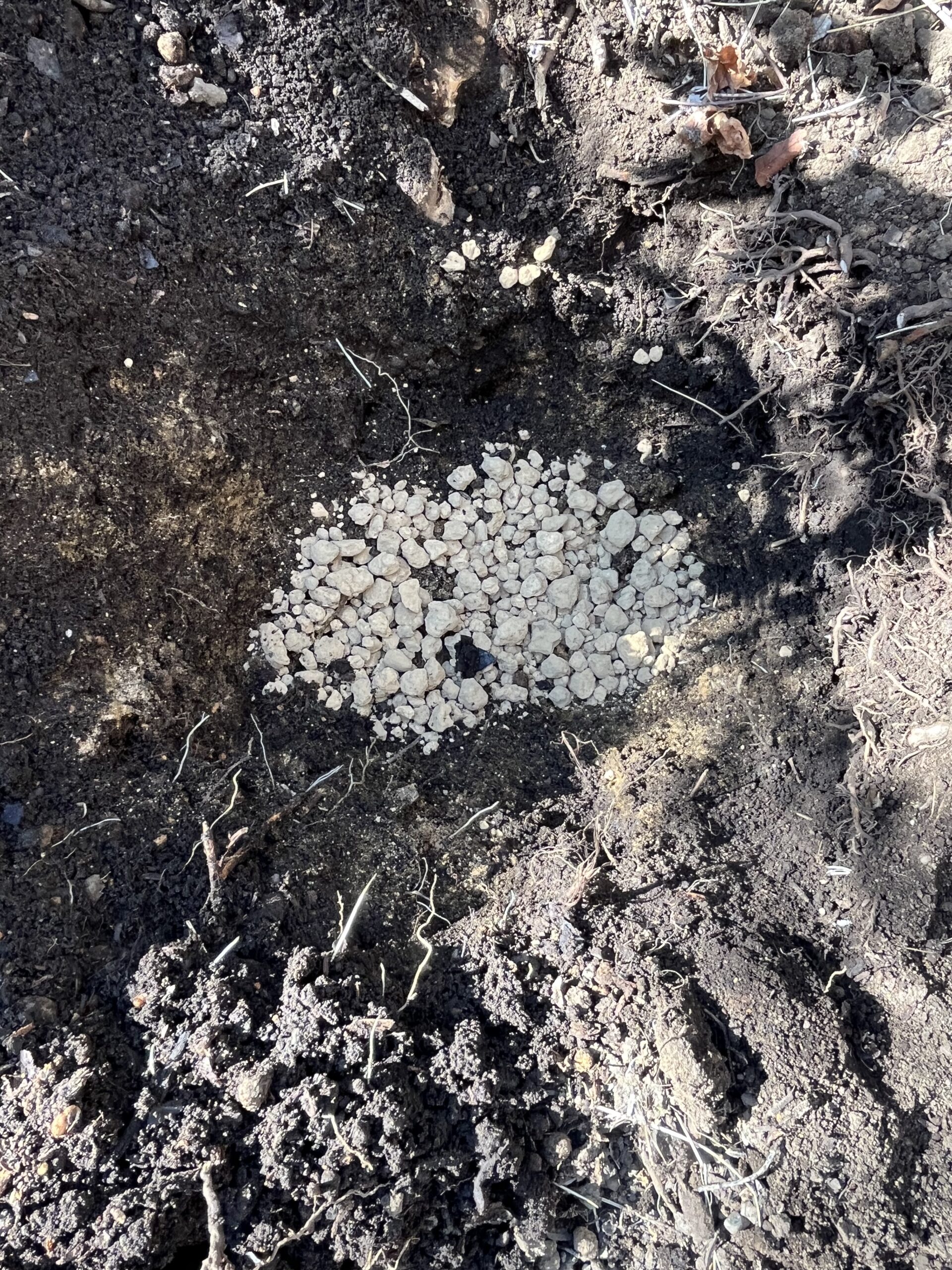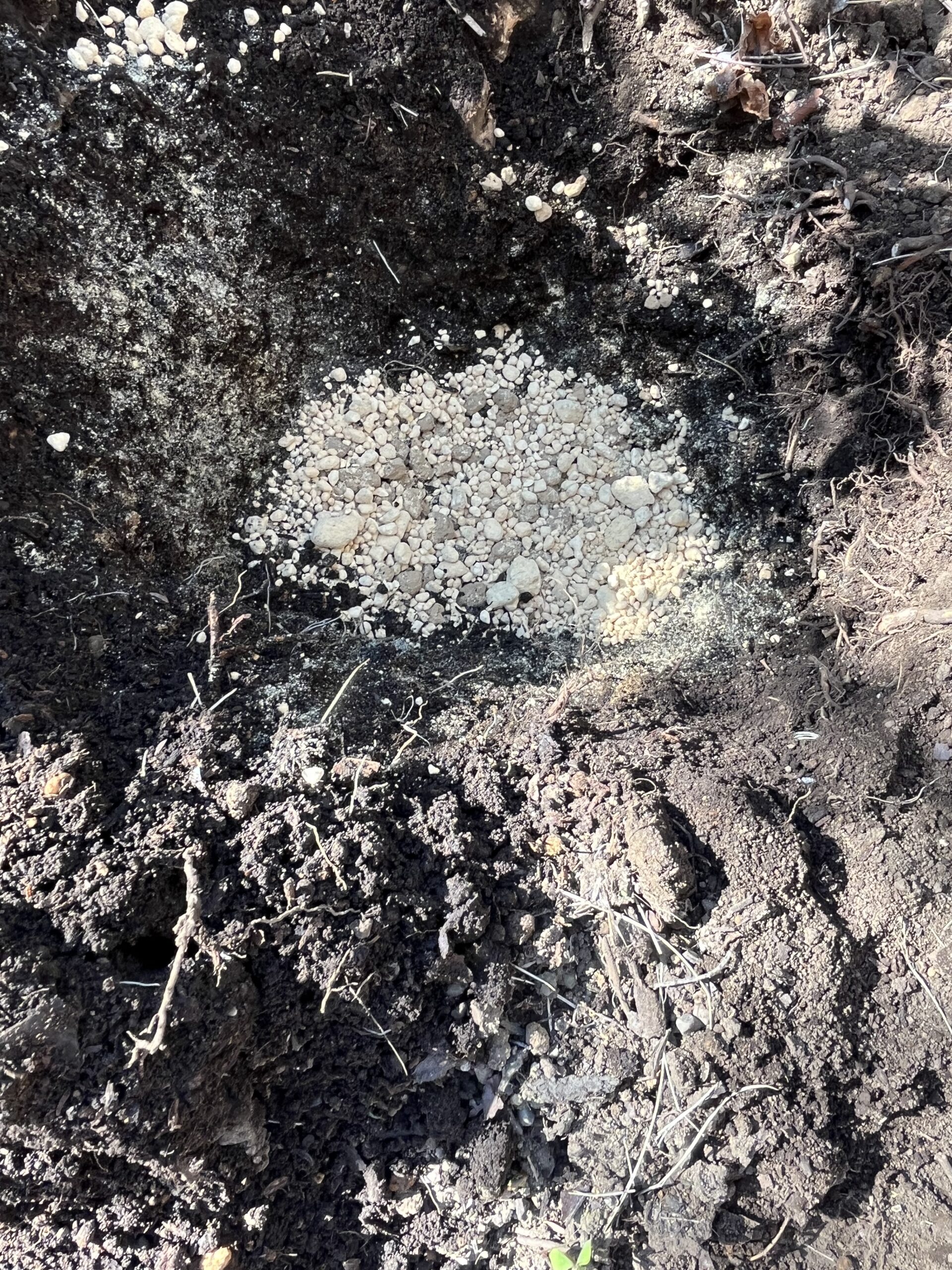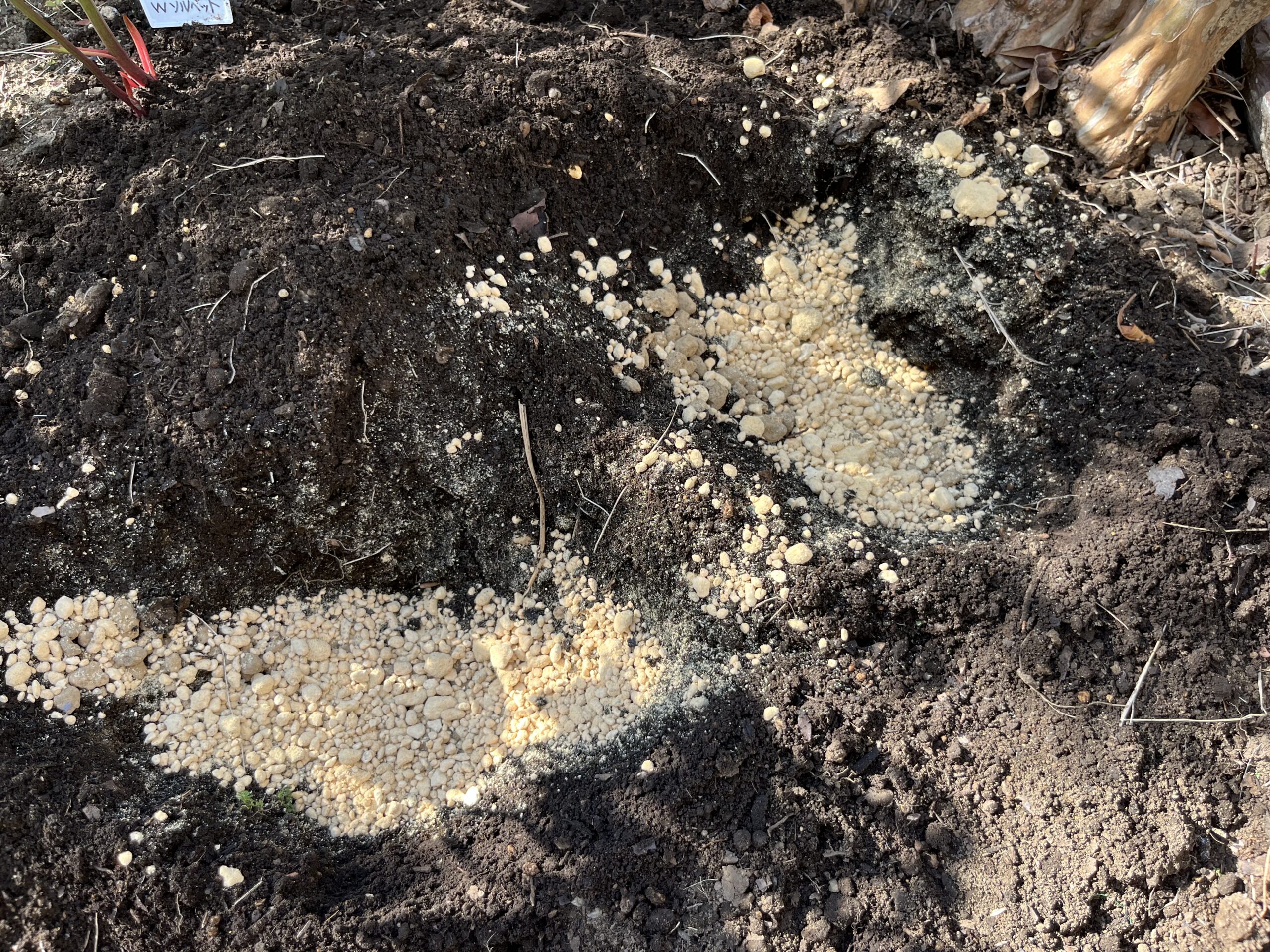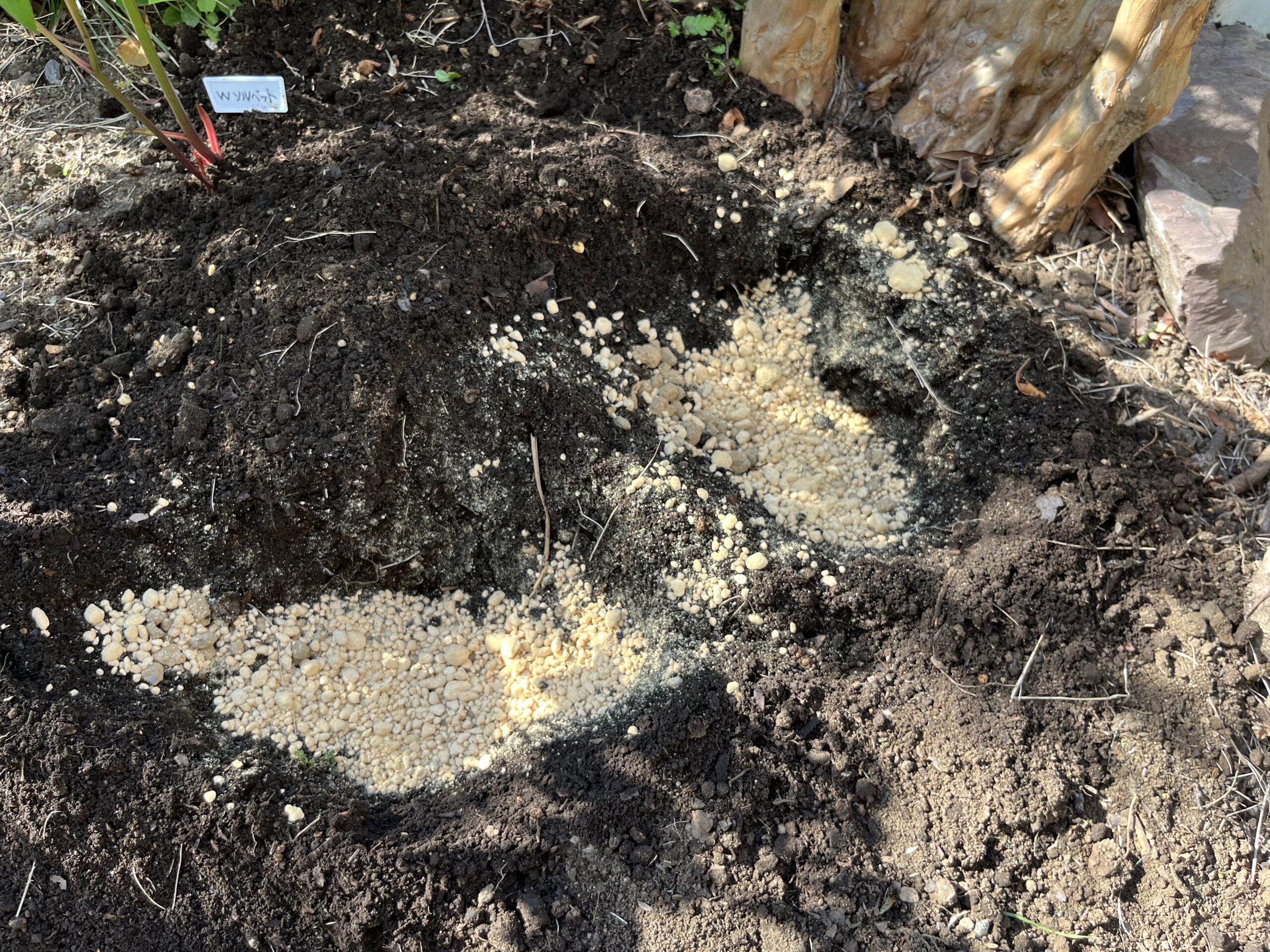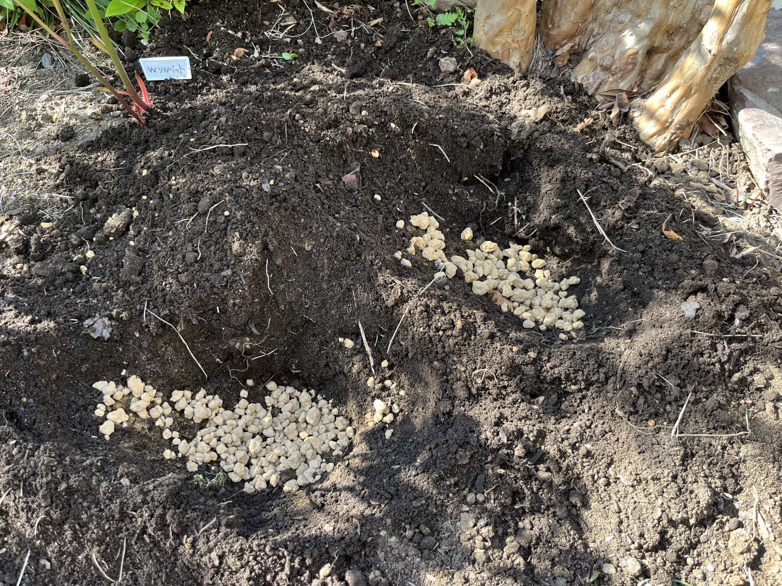 サルスベリの切り株に相当近づけたために、穴掘りが大変だったことと、この部分までは、土地の改良を施してなかったので、そこから作業を進める必要があった。