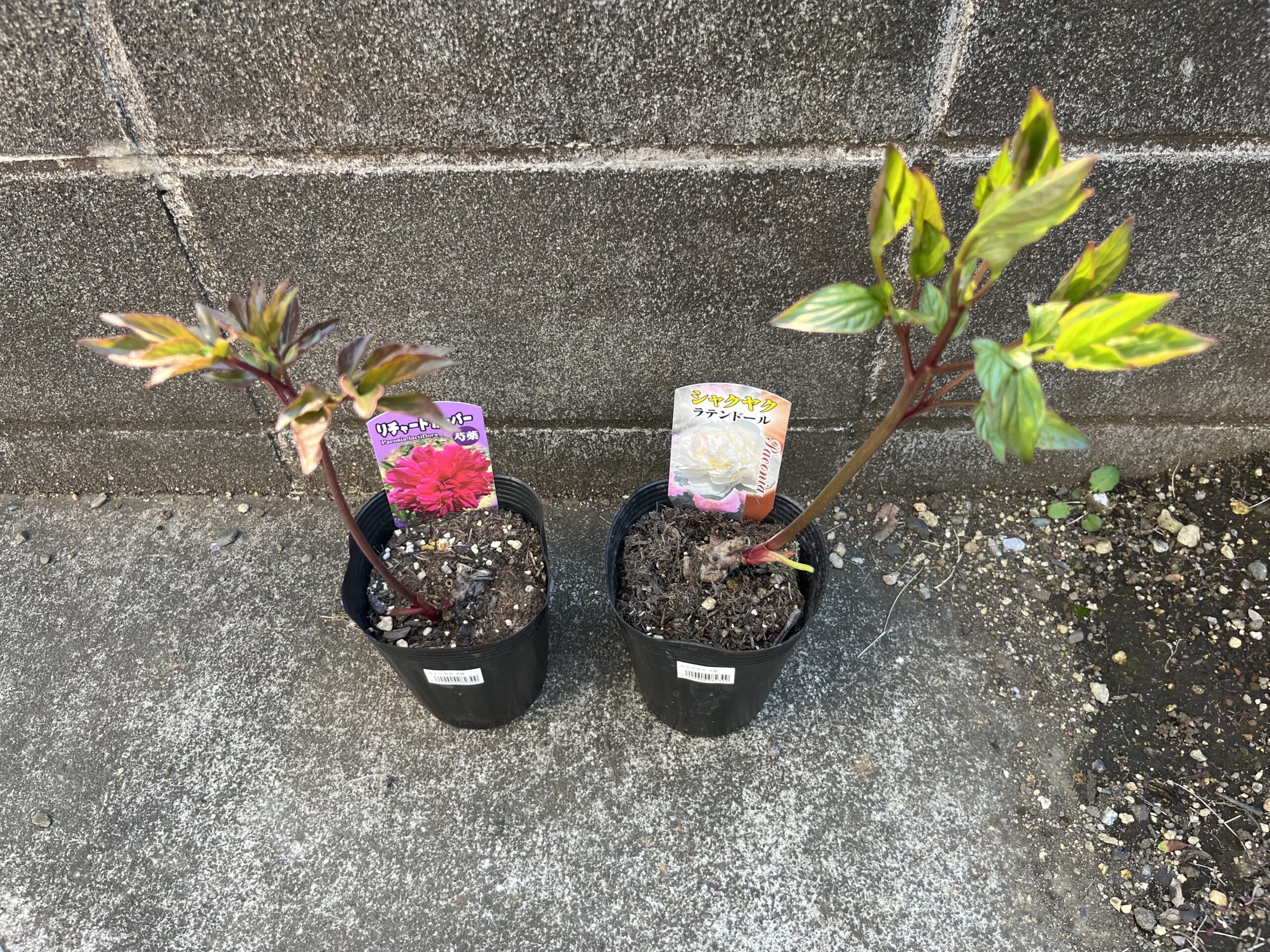 という経緯で、シャクヤクが開花の時期を迎える4月に、園芸店でシャクヤクの苗が売られていることが判明し、思わず3つの苗を購入してしまった。岐阜にお住いの「花子さん」のおっしゃっているとおりだった。