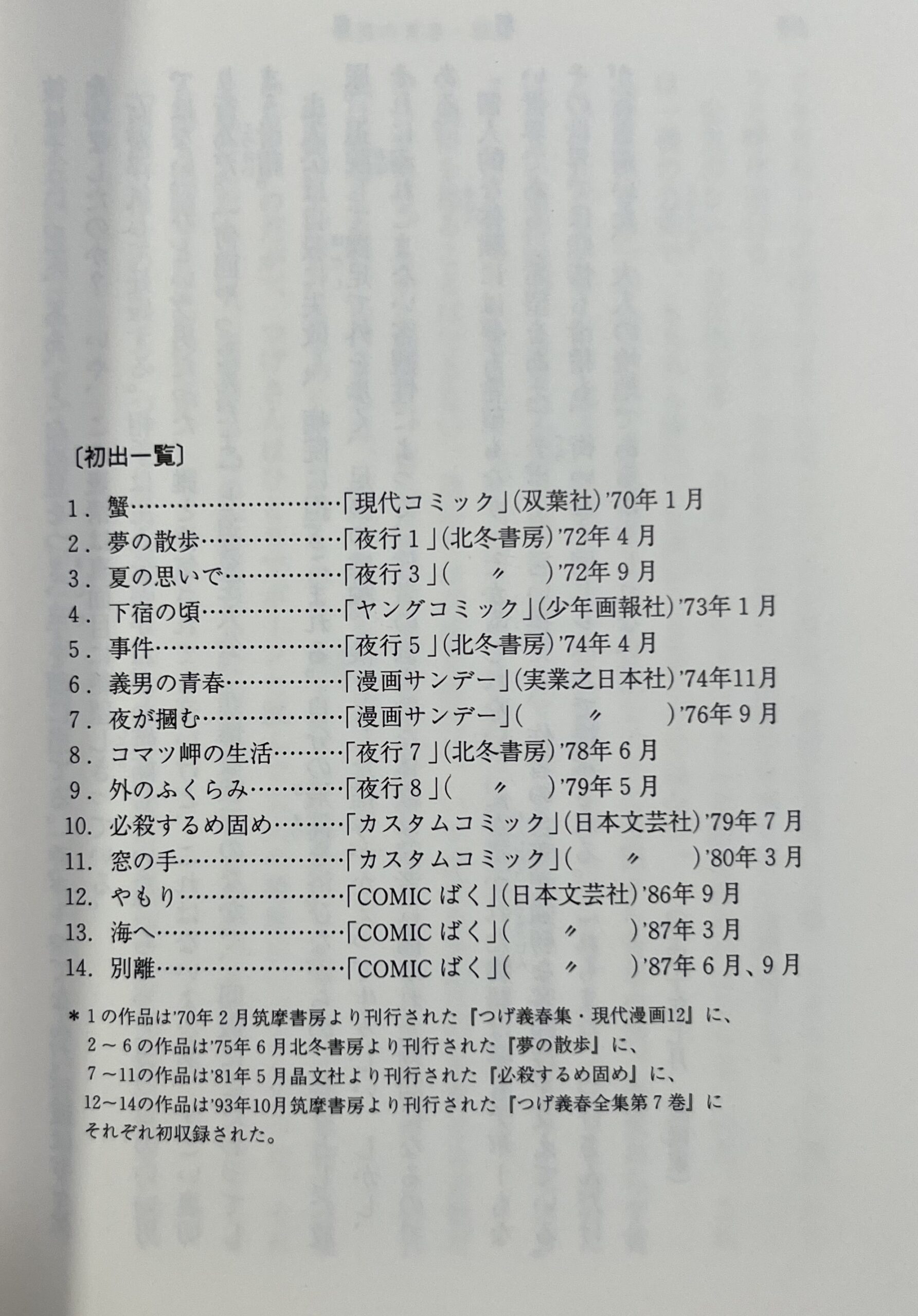 1970年1月発表の「蟹」から1987年6月、9月に発表されたつげ義春の最後の作品「別離」までの全14作品が、発表順に収められている。